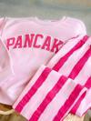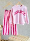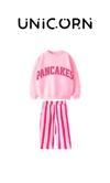 “PANCAKE” baskısı, çizgili denim alt parça ve %100 pamuklu sweatshirt ile 2–8 yaş çocuklar için hem eğlenceli hem konforlu iki parçalı takım!