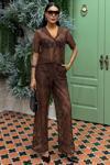 - Rahat kesimi ile günlük kullanım için ideal, kahverengi renkteki pantolonu astarlı dantel detaylarıyla şıklığına şıklık katıyor.; - Düz deseni sayesinde kolayca kombinlenebilir ve her ortamda zarif bir görünüm sunar.; - Regular kalıp, vücut hatlarınıza uyum sağlayarak konforlu bir deneyim yaşatır.; - Kadın ve kız kullanıcılar için tasarlanmış bu takım, casual koleksiyonun vazgeçilmez parçalarından biridir.; - Uzun boyu ile bacaklarınızı olduğundan daha uzun gösterirken, kısa kollu gömleğiyle yaz ayları için hafiflik sağlar.; - %97 polyester ve %3 likra materyal bileşeni esneklik kazandırarak hareket özgürlüğünüzü arttırır.; - Kuru temizleme önerisiyle bakımı kolaydır; böylece takımınız uzun süre ilk günkü gibi kalır.; - Gömlek-pantolon ikilisi olarak tasarlanmıştır; hem rahatlık hem de stil arayanlar için mükemmel bir seçimdir.; - Her mevsime uygun olan bu takım, tüm sezonlarda gardrobunuzun temel taşlarından biri olacak.