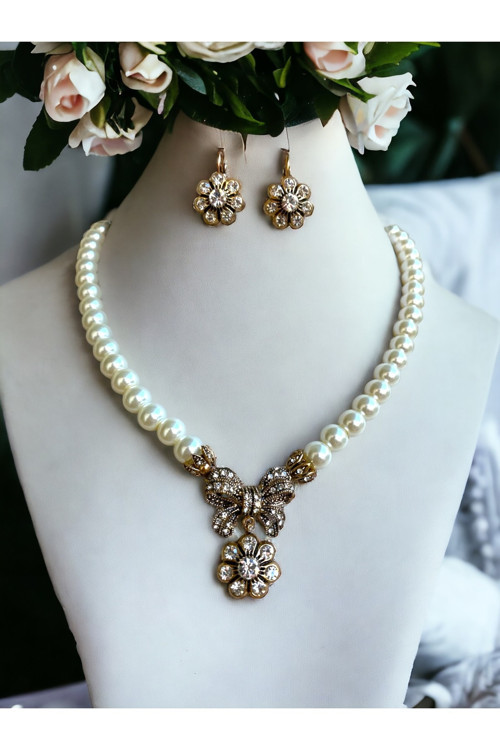 - Swarovski taş detaylarıyla süslenmiş, göz alıcı bir parlaklık sunar; - Bronz materyal bileşeni sayesinde dayanıklılık ve uzun ömürlü kullanım vaat eder; - Papatya sallantılı fiyonk figürü, zarif ve feminen bir tasarıma sahiptir; - İnci kolye ve küpe seti, her türlü özel gün ve günlük kullanım için idealdir;