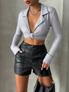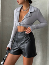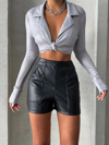 Bu şık ve şıklık arayan kadınlar için ideal olan siyah deri şort, gardırobunuzun vazgeçilmezi olmaya aday. Parçalı cepli tasarımı ile hem şık hem de kullanışlı bir görünüm sunar.