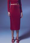 Yüksek bel, arka fermuarlı ve yırtmaçlı, iç astarlı, esnek, parlak kalem etek.
