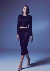 Yüksek bel, arka fermuarlı ve yırtmaçlı, iç astarlı, esnek, parlak kalem etek.