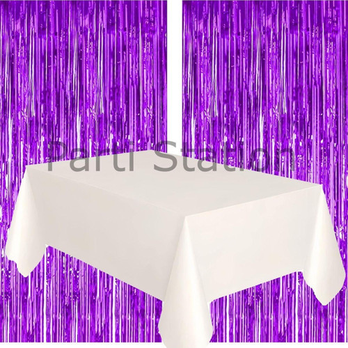 Parti Station 2 Adet Mor Renk Metalize Arka Fon Perdesi Ve 1 Adet Plastik Beyaz Renk Masa Örtüsü Set
