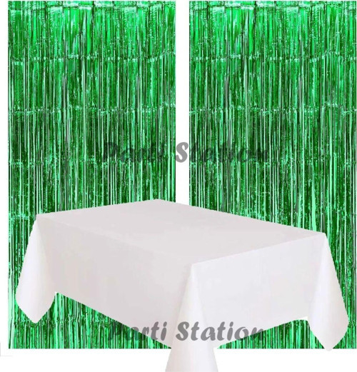 Parti Station 2 Adet Yeşil Renk Metalize Arka Fon Perdesi Ve 1 Adet Plastik Beyaz Renk Masa Örtüsü Set