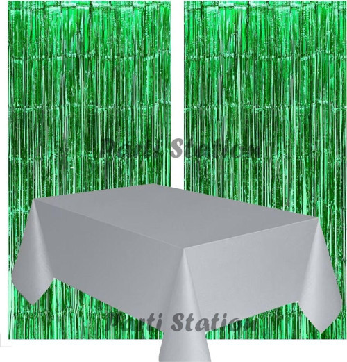 Parti Station 2 Adet Yeşil Renk Metalize Arka Fon Perdesi Ve 1 Adet Plastik Gümüş Gri Renk Masa Örtüsü Set