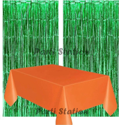 Parti Station 2 Adet Yeşil Renk Metalize Arka Fon Perdesi Ve 1 Adet Plastik Turuncu Renk Masa Örtüsü Set