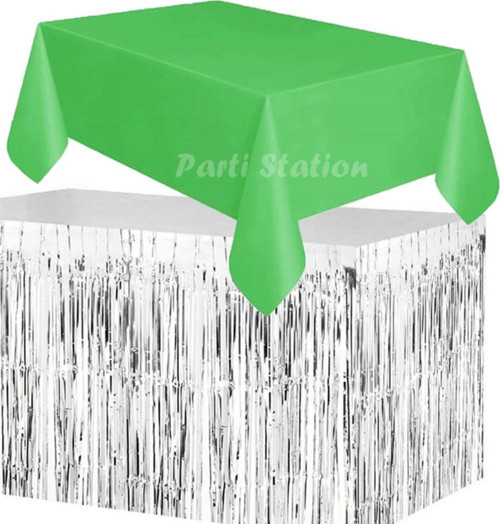 Parti Station Masa Örtüsü Ve Masa Eteği Set Plastik Yeşil Renk Masa Örtüsü Gümüş Renk Metalize Masa Eteği Set