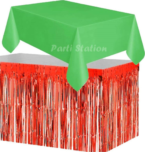 Parti Station Masa Örtüsü Ve Masa Eteği Set Plastik Yeşil Renk Masa Örtüsü Kırmızı Renk Metalize Masa Eteği Set