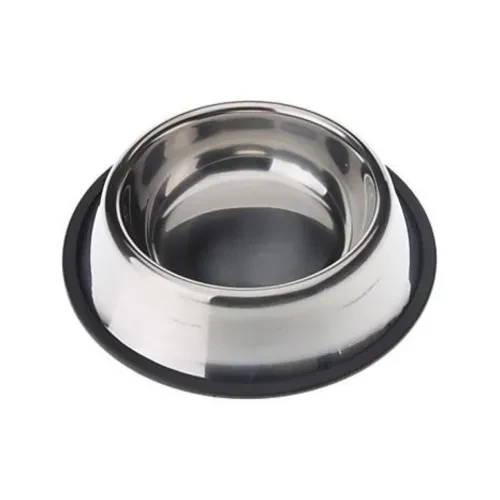 Görseldeki Paslanmaz Çelik Metal Mama Kabı, etrafındaki kaymaz siyah tabanı sayesinde mama ve su kabının yemek sırasında hareket etmesini ve dökülmesini önler.