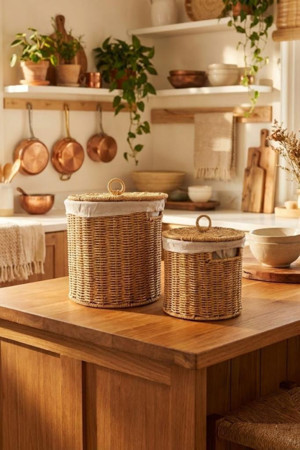 Rattan Hasır Patates Soğan ve Ekmek Saklama Sepeti - 2'li Set Kapaklı Bez Astarlı