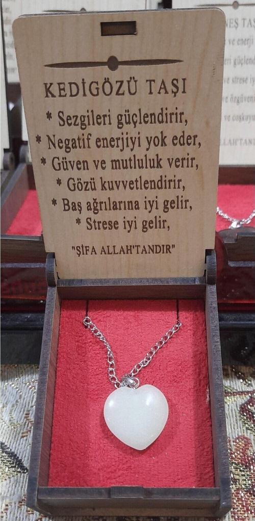 Doğal taş kullanımı ile öne çıkan bu kedi gözü taşı kolye, her kıyafetle uyum sağlayacak zarif bir aksesuar seçeneği sunar; Özel ahşap kutusu sayesinde, kolyenizi şık bir şekilde saklayabilir ve sevdiklerinize hediye olarak sunabilirsiniz; Kedi gözü taşı, hem göz alıcı bir görünüm kazandırır hem de kolyenin benzersizliğini artırır;