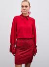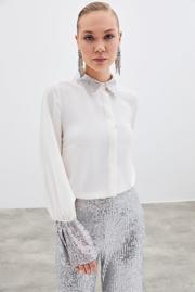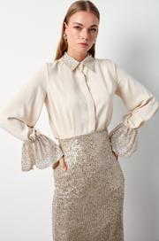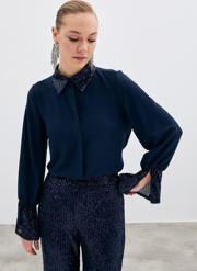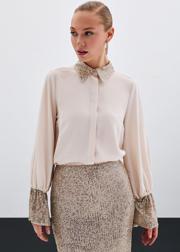 Ön gizli pat, kalça altı boy, kol ve yaka detaylı, payetli gömlek.
