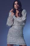 Yüksek bel, arka fermuarlı kapama, iç astarlı, payet detaylı mini etek.