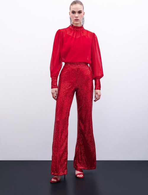 Yüksek bel, yan fermuarlı, içi astarlı, payetli salaş pantolon.