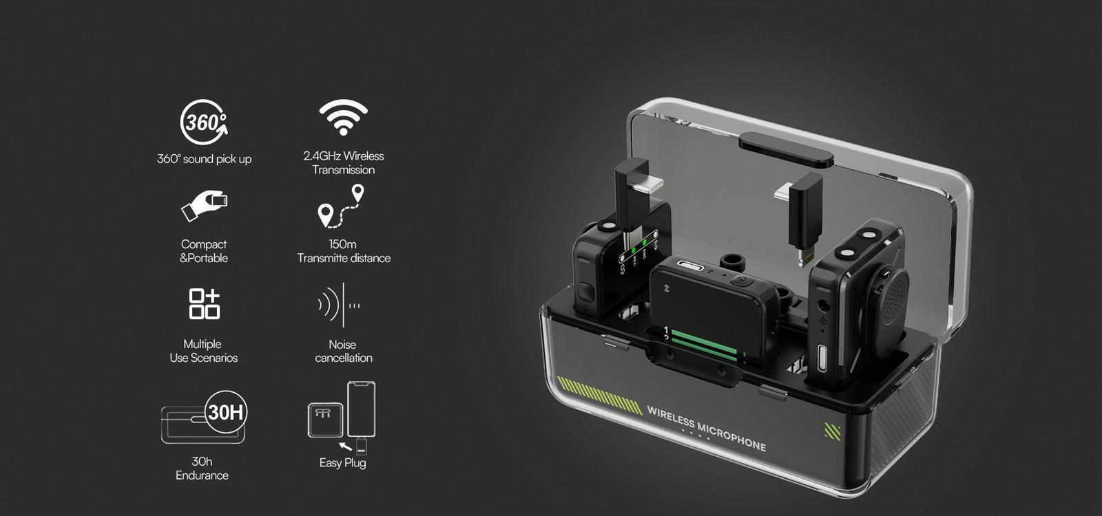 Paket içeriği: 2 adet TX, 1 adet RX, 1 adet şarj kutusu 1 adet 3.5mm TRS Konnektör, 1 adet Lightning konnektör, 1 adet USB-C konnektör, 1 adet USB-C şarj kablosu, 2 adet mikrofon tüyü.