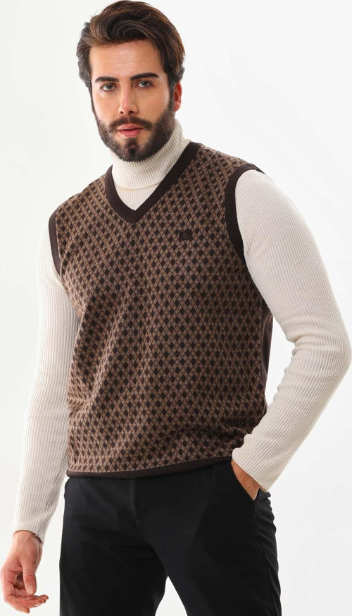 Detay: V yaka, desenli süveter;