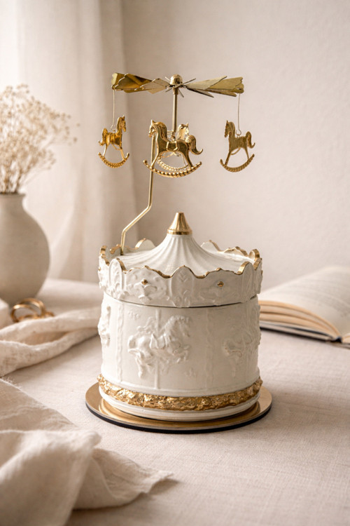 Üst kısmındaki kabartma at figürleri ve kubbe formu, ürüne klasik bir carousel estetiği kazandırırken
