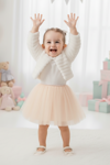 Şıklığı ve zarafeti bir arada sunan triko bolerolu kız bebek elbise modeli, minik prenseslerin özel günlerde parlaması için tasarlandı. Ekru renk elbisesi ve renkli tütü etek ile zarif bir bütünlük oluşturan bu model, hem klasik hem modern bir görünüm sunar.