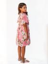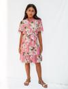 Pembe çiçek desenli, kısa kollu şifon kız çocuk elbisesi. Pamuk astarlıdır ve enseden düğmelidir.