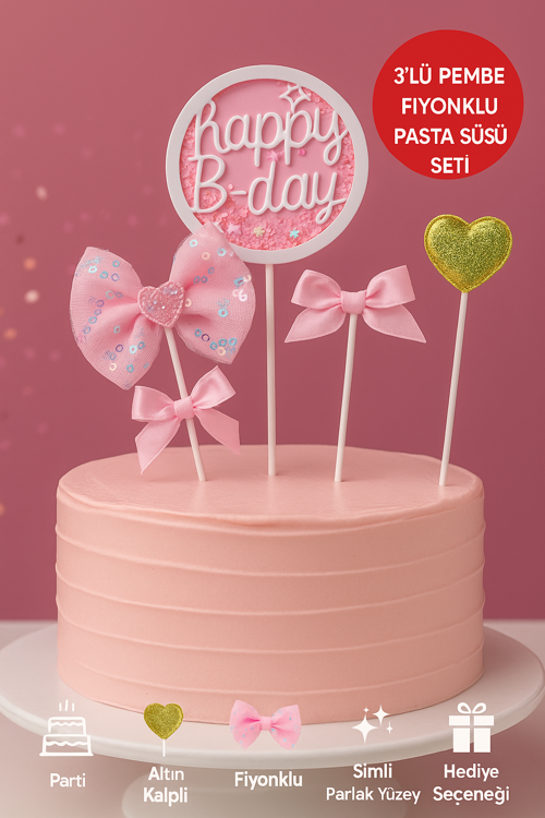 Doğum günü pastalarınıza zarafet ve neşe katın! Pembe pullu fiyonk 🎀, altın kalp 💛 ve simli “Happy B-day” yazısı ile kutlamalarınıza ışıltı kazandırır.