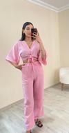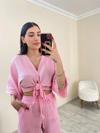 ? Ürün Özellikleri: Özellik Açıklama Kumaş Türü %100 pamuk (müslin / gauze) Renk Pembe Üst Parça Bağlamalı crop, V yaka, geniş kol Alt Parça Lastikli bel, düğme detaylı, cepli Paça Tipi Düz paça Kalıp Rahat – Oversize üst, rahat alt Kullanım Alanı Günlük, tatil, ev giyimi Sezon İlkbahar / Yaz Astarlama Astarsız – iç göstermeyen kumaşNeden idefix?