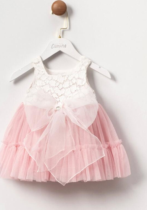 Kız çocukları için tasarlanan bu pembe elbise, dantel üst kısmı ve tül etekleriyle dikkat çekiyor. Kolsuz tasarımı ve belindeki büyük tül fiyonk, elbiseye zarif bir dokunuş katıyor.