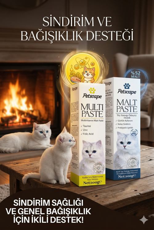 Petscape Multivitamin Macun 100g (Kediler İçin Multivitamin Macunu - Tüy Yumak Önleyici Macun) Petscape multivitamin macunu kedilerin sağlıklı gelişimini destekleyen, vücut dirençlerini arttıran vitaminler ve amino asitler içeren tamamlayıcı yemdir. Direnci güçlendiren, metabolik gelişimi hızlandıran, deri ve tüy sağlığını destekleyen, enerji ve canlılık veren 18 önemli vitamin içeren vitamin ve mineral desteğidir. Ayrıca kalp ve göz sağlığını destekleyen taurin, vücut sistemini destekleyen prebiyotik mannan oligosakkarit (m.O.S.) içerir. Şeker içermez. Analitik Bileşenler
