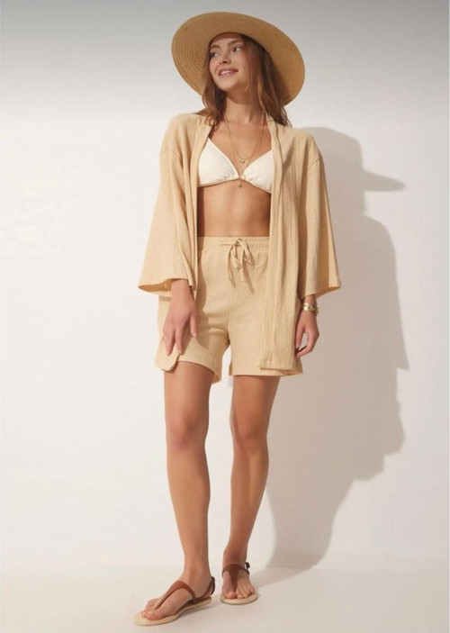 Bluz ve şorttan oluşan alt-üst takım, pratik kombin seçenekleriyle günlük giyimin vazgeçilmezi olur.