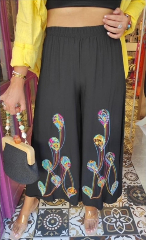Günlük kullanım için ideal, casual tarza sahip nakış işlemeli viskon beli lastikli pantolon, her ortama uyum sağlayacak şekilde tasarlanmıştır.