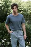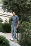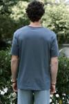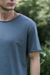 Kayık yaka, kol ucu ve yaka pis dikişli, rahat formda, erkek pamuklu t-shirt.