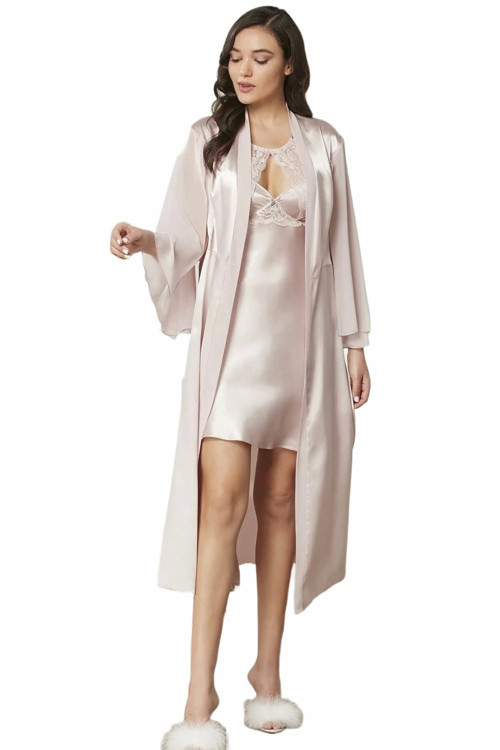 Pierre Cardin Saten Dantelli Gecelik ve Sabahlık Takımı 4375 Pudra