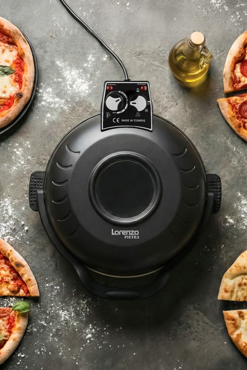 LORENZO Pietra 12 in 1 Pizza Makinesi Lahmacun Tandır Ekmeği Bazlama ve Fırın Yemekleri Tepsi Hediyeli Siyah