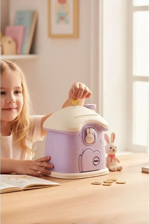Piev Dekoratif Sevimli Anahtarlı Ev Baca Para Kumbarası Mor