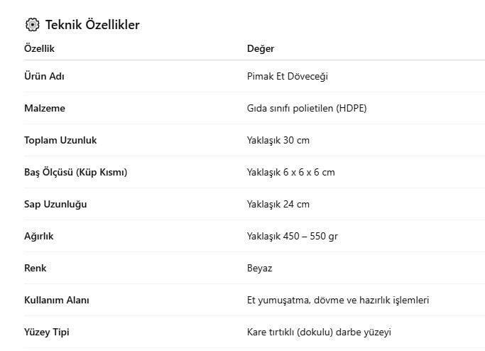 Pimak Et Döveceği, dayanıklı polietilen gövdesi sayesinde uzun ömürlü ve hijyeniktir. Etlerin dokusunu bozmadan yumuşatır, pişirme kalitesini artırır. Ergonomik sap tasarımı ile rahat kavrama ve kolay kullanım sağlar. Profesyonel mutfaklar, kasaplar ve restoranlar için idealdir.