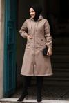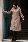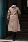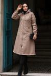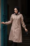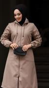 Günlük kullanıma uygun, kapüşonlu tasarımıyla hem rahatlık hem de stil sunan kadın tesettür trençkot.