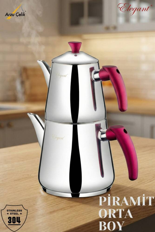 Piramit serisi orta boy çaydanlık takımı, köşeli ve modern formu ile mutfakta şık bir görünüm sunar. 304 paslanmaz çelik gövdesi dayanıklıdır. Füme bakalit kulpları sayesinde elde güvenli ve konforlu bir tutuş sağlar. Takım; 1,75 L alt suluk ve 1 L üst demlikten oluşur. İndüksiyon uyumlu tabanı sayesinde farklı ocak tiplerinde güvenle kullanılabilir. Ürün Türkiye menşeli olup 2 yıl garanti ile sunulmaktadır.