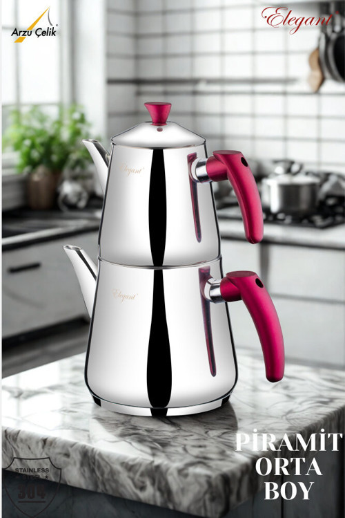 Piramit serisi orta boy bakalit kulplu çaydanlık takımı, köşeli ve modern tasarımıyla mutfaklarda şık bir görünüm sunar. 304 paslanmaz çelik gövdesi dayanıklı ve uzun ömürlü kullanım sağlar. Bakalit kulplar, ısıyı iletmeyen yapısıyla güvenli ve konforlu tutuş sunar.