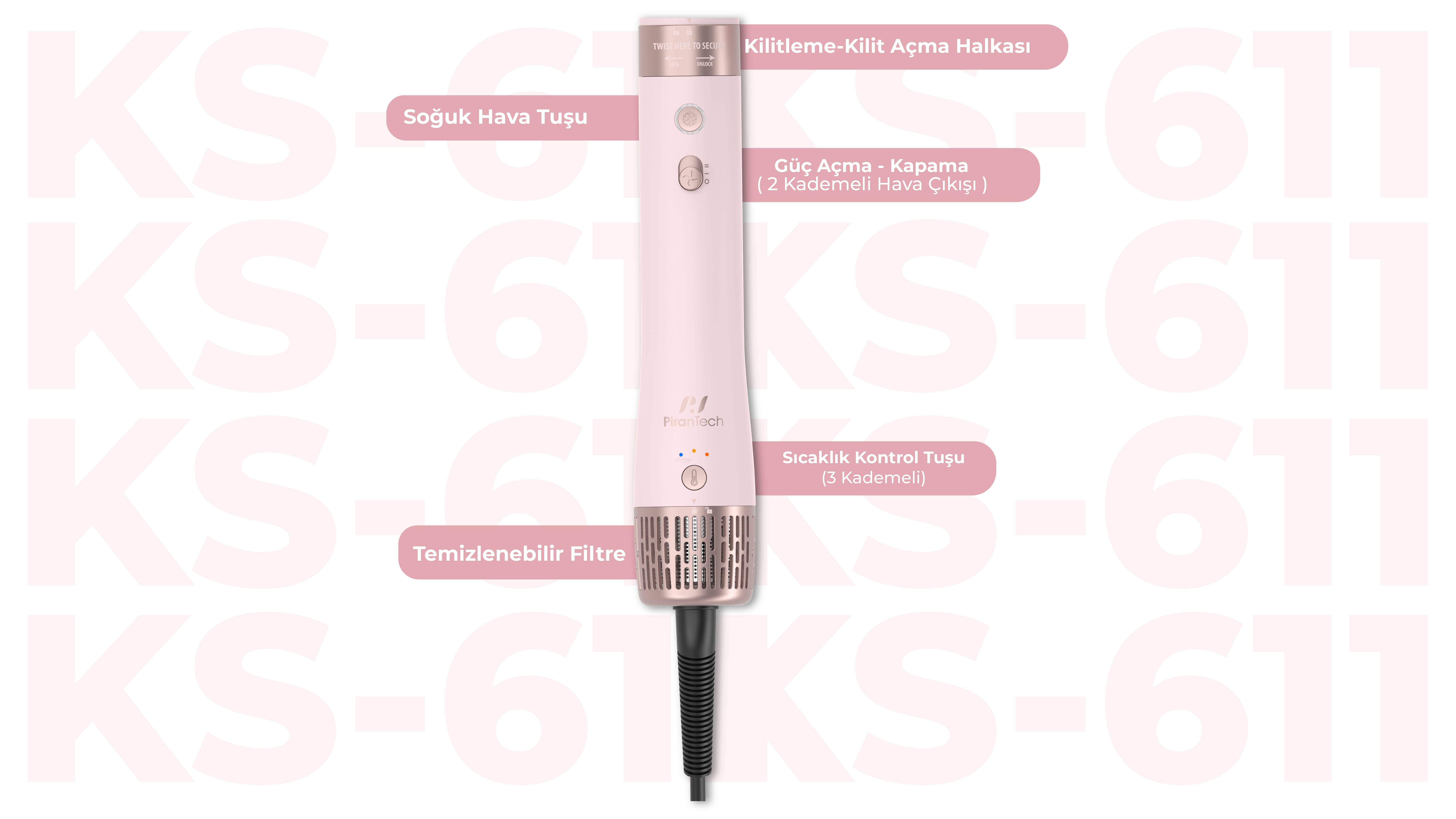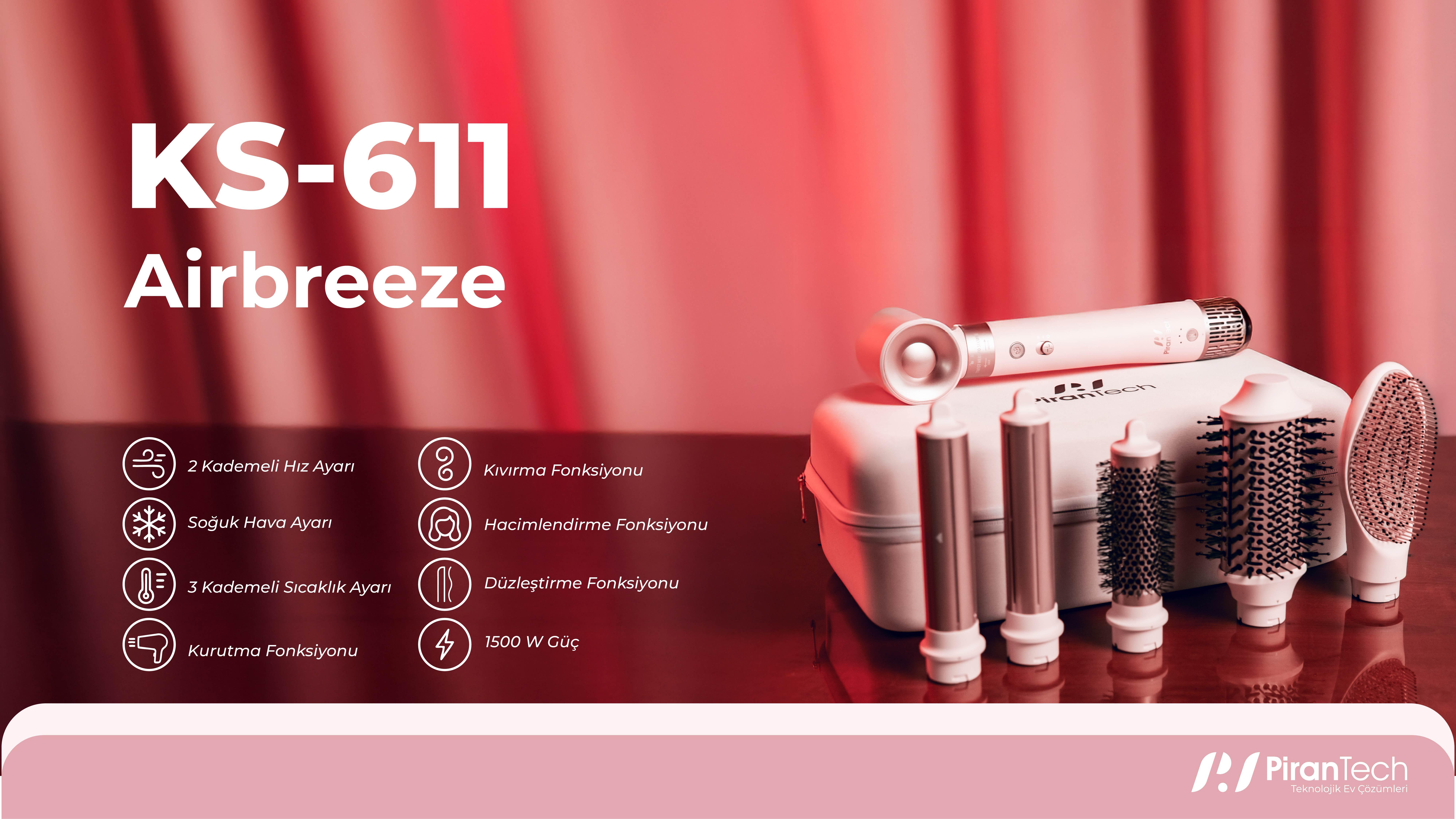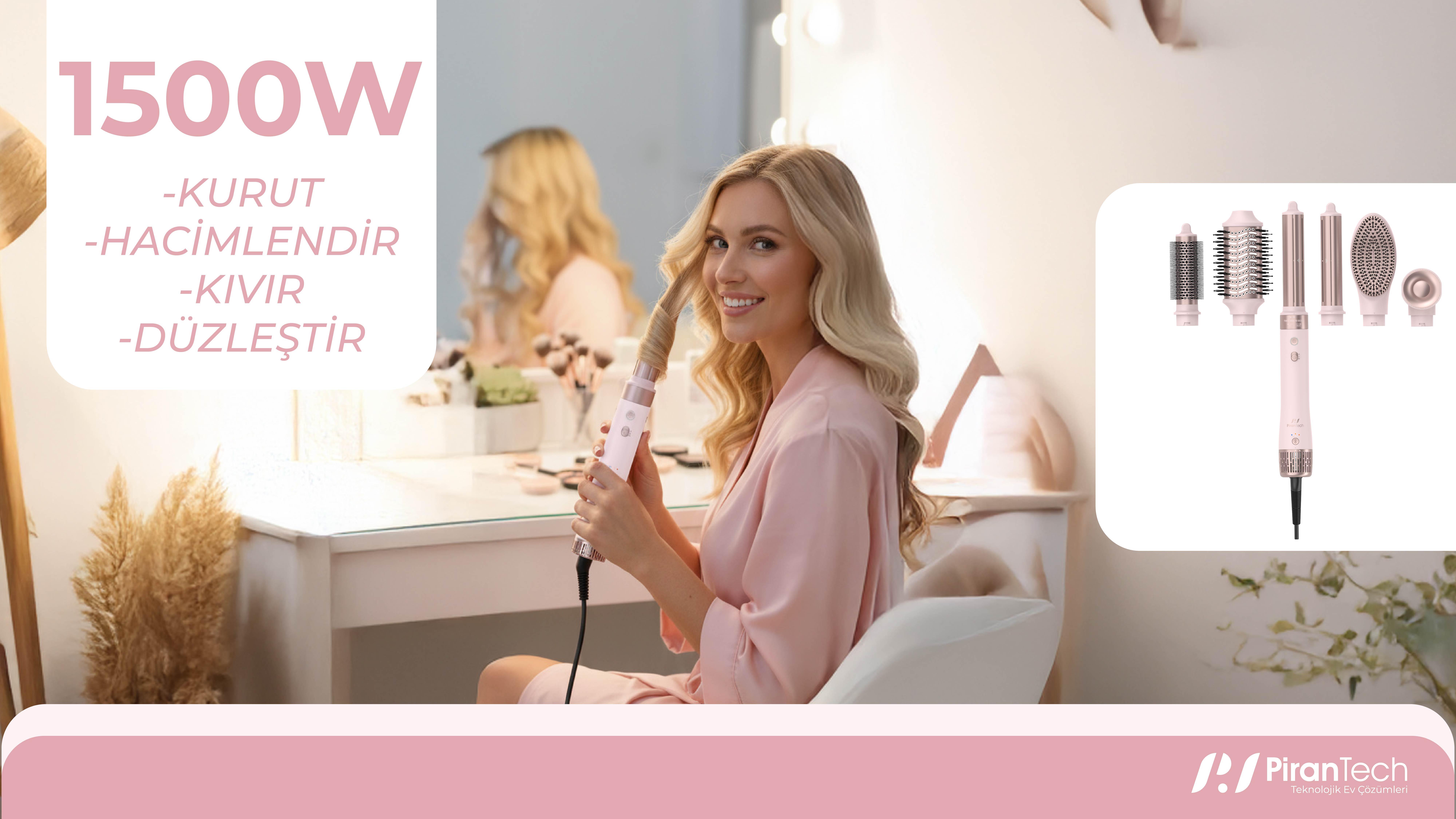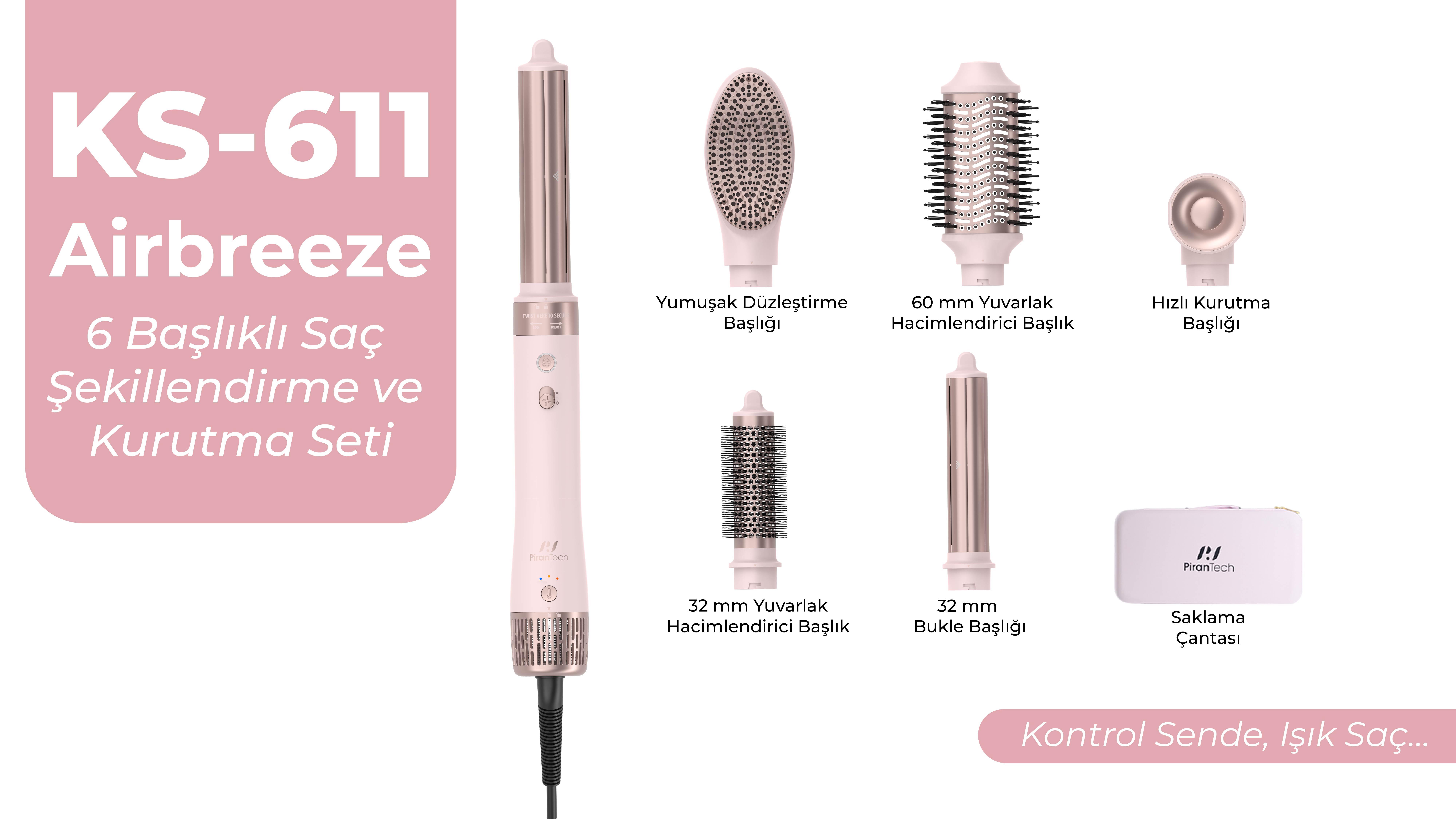 Pirantech KS-611 Style-Airwrap Saç Şekillendirme ve Kurutma Seti, profesyonel saç şekillendirme deneyimini evinize getiriyor. 1500W gücüyle hızlı kurutma sağlarken, 6 farklı başlığı sayesinde dilediğiniz tarzı yaratmanıza yardımcı olur.