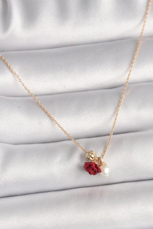 Acousticworld Pirinç Gold Renk Gül Model İnci Detay Kadın Kolye