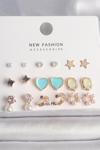 Skygo Pirinç Gold Renk Zirkon Taşlı İncili Çiçek Mavi Kalp Figür 9 Çift Kadın Küpe Seti - TJ-BKP10180