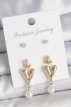 Pirinç Gold Renk Zirkon Taşlı İncili Sallantılı Kalp Model 3 Çift Kadın Küpe Seti