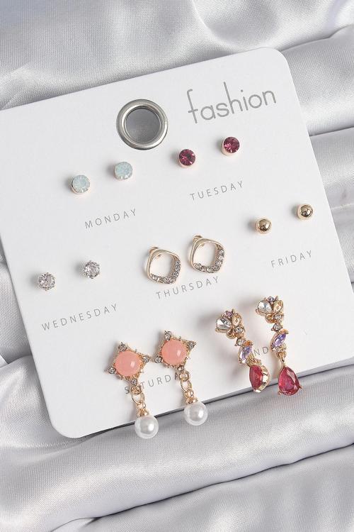 Pirinç Gold Renk Zirkon Taşlı Sallantı İnci Detay 7 Çift Kadın Küpe SL11790
