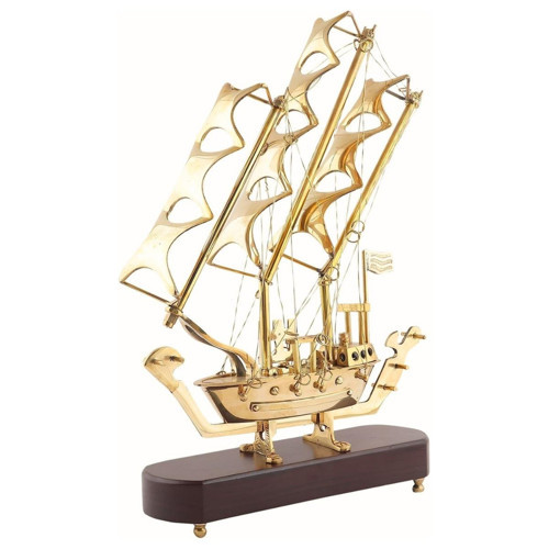 Pirinç Yelkenli Gemi Ahşap Kaideli Ev Ofis Dekorasyon 33cm