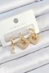 Pirinç Zirkon Taşlı Kare Model Gold Renk 3'lü Çift Kadın Küpe Set