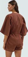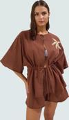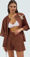 Bu yaz, plaj günlerinizi rahat ve şık bir şekilde geçirmek için mükemmel bir seçim olan kahverengi pamuklu bluz şort takımımızla tanışın. %100 pamuk dokuma kumaştan üretilen bu takım, yaz sıcağında nefes alabilirliği ve yumuşak dokusuyla sizi serin tutar. Dik yakası ve truvakar kolları ile şık bir görünüm sunarken, rahat kesimiyle gün boyu konfor sağlar. Plajda, havuz başında veya günlük yaşamda rahatlıkla kullanabileceğiniz bu takım, tarzınıza ve rahatlığınıza odaklanmıştır.