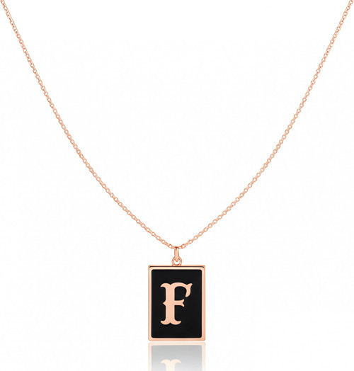 Bu kolye, yüksek kaliteli 925 Ayar Gümüşten üretilmiş olup, günümüzün en popüler takı trendi olan ışıltılı rose altın kaplama ile kaplanmıştır. Kolye ucundaki dikdörtgen plaka, çarpıcı bir kontrast yaratmak üzere parlak siyah mine (emaye) ile doldurulmuştur. Bu siyah zemin üzerinde, kolyeyi taşıyan kişinin baş harfini temsil eden, zarif ve dikkat çekici bir stilize harfi öne çıkar.