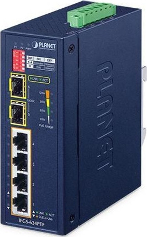 Planet PL-IFGS-624PTF 4 Port 100Mbps 2 Port SFP Industrial Ethernet Switch Hardware SpecificationsCopper Ports4 x 10/100BASE-TX RJ45 TP Auto-MDI/MDI-X, auto-negotiationPoE+ Injector PortsFour ports with 802.3at PoE+ injector function (Ports 1 to 4)SFP Slots2 x 1000BASE-X SFP interfacesDIP SwitchDIP-1-4PositionOFF (default)/ONFunctionStandard/Port 1-4 Extended ModeDIP-5PositionOFF (default)/ONFunctionStandard/RingNote :1.Power off the Industrial Ring Ethernet Switch before adjusting the DIP switch and then power it on.2.Extend mode: PoE transmission distance of 250m at speed of 10Mbps.3.The Ring function can connect to a simple Ring network with up to 8 units; the recovery time of data link can be as fast as 1ms.4.Ring performance may vary depending on the length of the fiber optic and UTP cables.5.The active Ring function is not compatible with the IEEE 802.1p class of service function.ConnectorRemovable 6-pin terminal blockPin 1/2 for Power 1; Pin 3/4 for fault alarm; Pin 5/6 for Power 2AlarmProvides one relay output for power failureAlarm Relay current carry ability: 1A @ DC 24VESD Protection±6KV air gap discharge±6KV contact dischargeSurge Immunity6KV DCEnclosureIP40 type metal caseInstallationDIN-rail kit and wall-mount earDimensions (W x D x H)50 x 86.1 x 135mmWeight613gPower RequirementsDC 12~54VRedundant power with reverse polarity protectionPower Consumption / DissipationMax. 7 watts/23.8BTU@54V DC input (System)Max. 140 watts/477BTU@54V DC input(Ethernet + PoE Full Loading)LED3 x LED for System and Power:?Green: DC Power 1?Green: DC Power 2?Red: Alarm2 x LED for Copper Ports (Ports 1 to 4):?Green: 10/100 LNK/ACT?Amber: PoE-in-Use1 x LED for SFP interface (Ports 5 to 6)?Green: 1G LNK/ACT4 x LED for PoE Usage (W) (Low to high):?Amber: 30W, 60W, 90W and 120WSwitch SpecificationsSwitch Processing SchemeStore-and-ForwardSwitch Fabric4.8GbpsThroughput (packet per second)3.57Mpps@64bytesAddress Table4K entriesJumbo Frame16K bytesFlow ControlBack pressure for half duplexIEEE 802.3x pause frame for full duplexPower over EthernetPoE StandardIEEE 802.3at Power over Ethernet Plus/PSEPoE Power Supply TypeEnd-spanPower Pin Assignment1/2 (+), 3/6 (-)PoE Power OutputPer port 54V DC, Max. 36 wattsPoE Power Budget (max.)120W maximum @48-54V DC100W maximum @24V DC60W maximum @12V DCMax. Number of Class 2 PDs4Max. Number of Class 3 PDs4Max. Number of Class 4 P