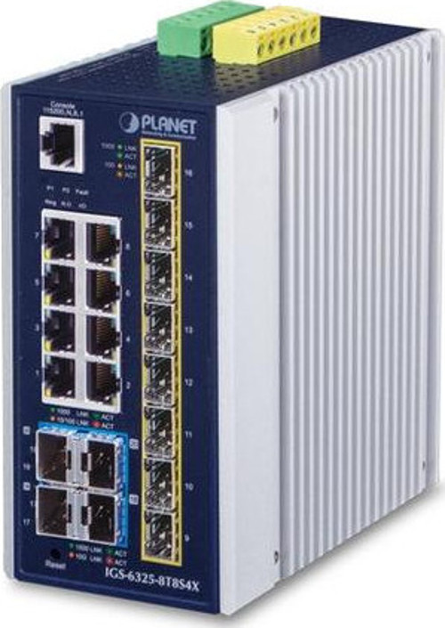 Planet PL-IGS-6325-8T8S4X 8 Port 1000T 8 Port SFP+ 4 Port 10G SFP Endustriyel Yönetilebilir Switch Hardware SpecificationsCopper Ports8 10/100/1000BASE-T RJ45 auto-MDI/MDI-X portsSFP Ports8 100/1000/2500BASE-X SFP slot interfaces (Port-9 to Port-16)Compatible with 100BASE-FX and 2500BASE-X SFP transceiverSFP+ Ports4 10GbBASE-SR/LR SFP+ slot interfacesCompatible with 1000BASE-SX/LX/BX and 2500BASE-X SFP transceiverConsole1 x RJ45-to-RS232 serial port (115200, 8, N, 1)Switch ArchitectureStore-and-ForwardSwitch Fabric136Gbps/non-blockingThroughput83.33Mpps@64BytesAddress Table16K entries, automatic source address learning and agingShared Data Buffer32MbitsJumbo Frame10K bytesSDRAM512MbytesFlash Memory64MbytesFlow ControlIEEE 802.3x pause frame for full duplexBack pressure for half duplexReset Button< 5 sec: System reboot> 5 sec: Factory defaultConnectorRemovable 6-pin terminal block for power inputPin 1/2 for Power 1, Pin 3/4 for fault alarm, Pin 5/6 for Power 2Removable 6-pin terminal block for DI/DO interfacePin 1/2 for DI 1 & 2, Pin 3/4 for DO 1 & 2, Pin 5/6 for GNDAlarmOne relay output for power failure. Alarm relay current carry ability: 1A @ 24V DCDigital Input (DO)2 digital input:Level 0: -24~2.1V (±0.1V)Level 1: 2.1~24V (±0.1V)Input load to 24V DC, 10mA max.Digital Output (DO)2 digital output:Open collector to 24VDC, 100mAEnclosureIP30 aluminum caseInstallationDIN-rail or wall mountingDimensions (W x D x H)76.8 x 107.3 x 152 mmWeight1,250gPower RequirementsDC 12~48V, 4A max.AC 24V, 2A max.Power ConsumptionDC input:Max. 12 watts/41BTU (system on)Max. 38.4 watts/132 BTU (Full loading)AC 24V input:Max. 13 watts/45BTU (system on)Max. 38 watts/130 BTU (Full loading)ESD Protection6KV DCSurge Protection4KV DCLED IndicatorsSystem:?Power 1 (Green), Power 2 (Green)?Fault Alarm (Red)?Ring (Green), Ring Owner (Green)?DIDO (Red)Per 10/100/1000T RJ45 Port:?1000Mbps LNK/ACT (Green)?10/100Mbps LNK/ACT (Amber)Per SFP Port:?1000Mbps LNK/ACT (Green)?100Mbps LNK/ACT (Amber)Per SFP+ Port:?10Gbps LNK/ACT (Amber)?1Gbps LNK/ACT (Green)Layer 2 FunctionsPort ConfigurationPort disable/enableAuto-negotiation 10/100/1000Mbps full and half duplex mode selectionFlow control disable/enablePort link capability controlPort StatusDisplay each port’s speed duplex mode, link status, flow control status, auto-negotiation status, trunk statusPort MirroringTX/RX/