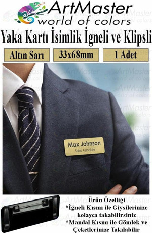 ArtMaster İğneli ve Klipsli İsimlik Altın Sarı 1 Adet Yaka İsimliği Personel Yaka Kartı Şirket İsimliği 68x33cm İşyeri Büro Ofis