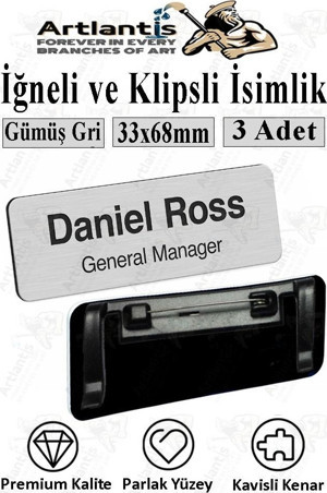 Artlantis Personel Yaka İsimliği Gümüş Gri 3 Adet İğneli ve Klipsli Yaka Kartı 33x68 mm Personel Büro Ofis Şirket İş Yeri
